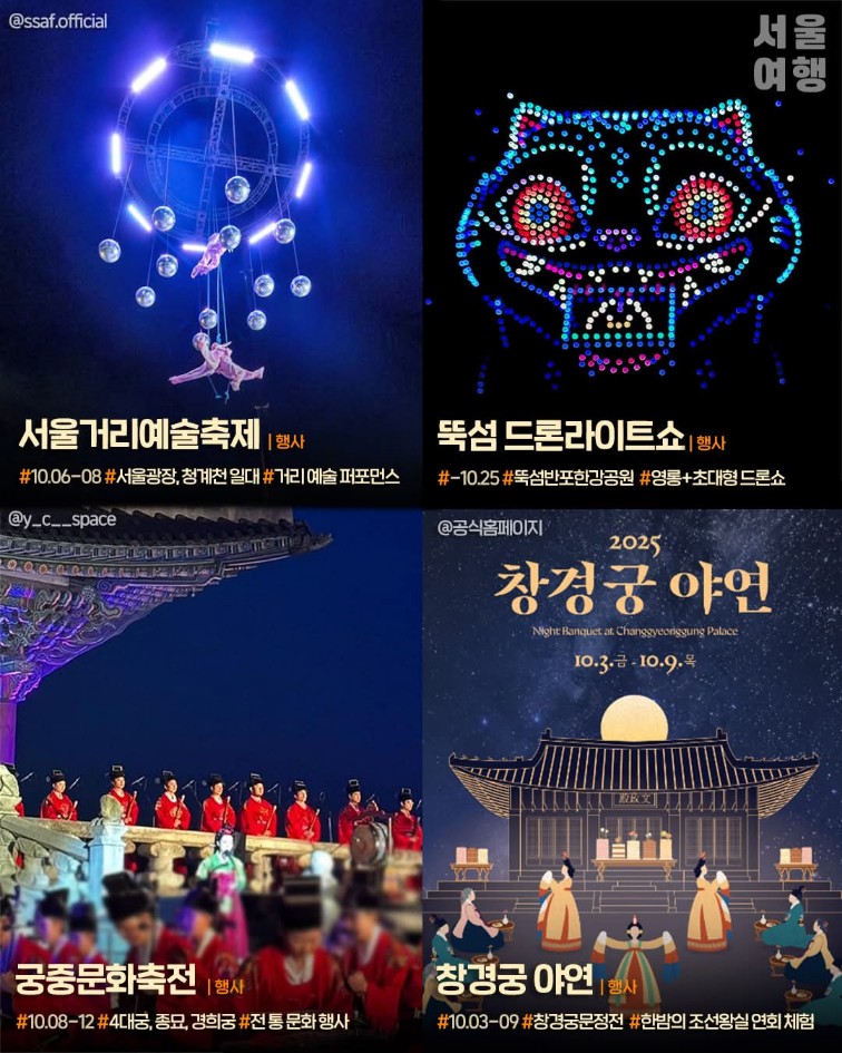- 서울거리예술축제: 서울 곳곳의 거리에서 펼쳐지는 역동적인 공연들. 가족, 친구와 함께 가볍게 즐기기 좋습니다.