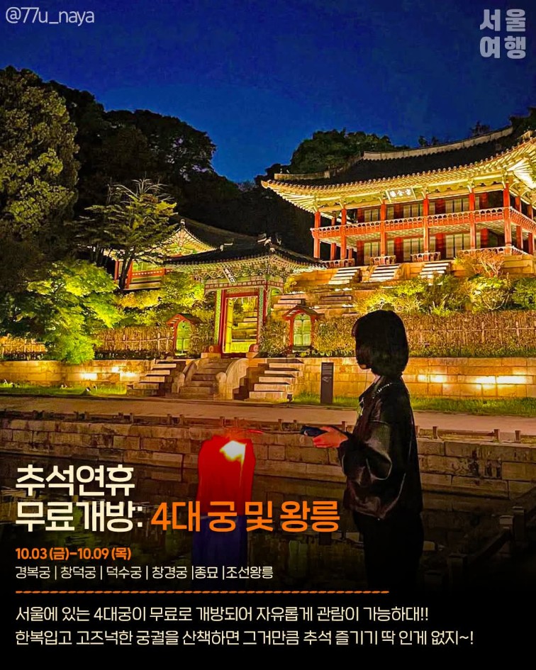 - 특징: 한복 착용 시 평소에도 무료입장이지만, 연휴 기간에는 모두에게 무료 개방되어 부담 없이 방문할 수 있습니다.