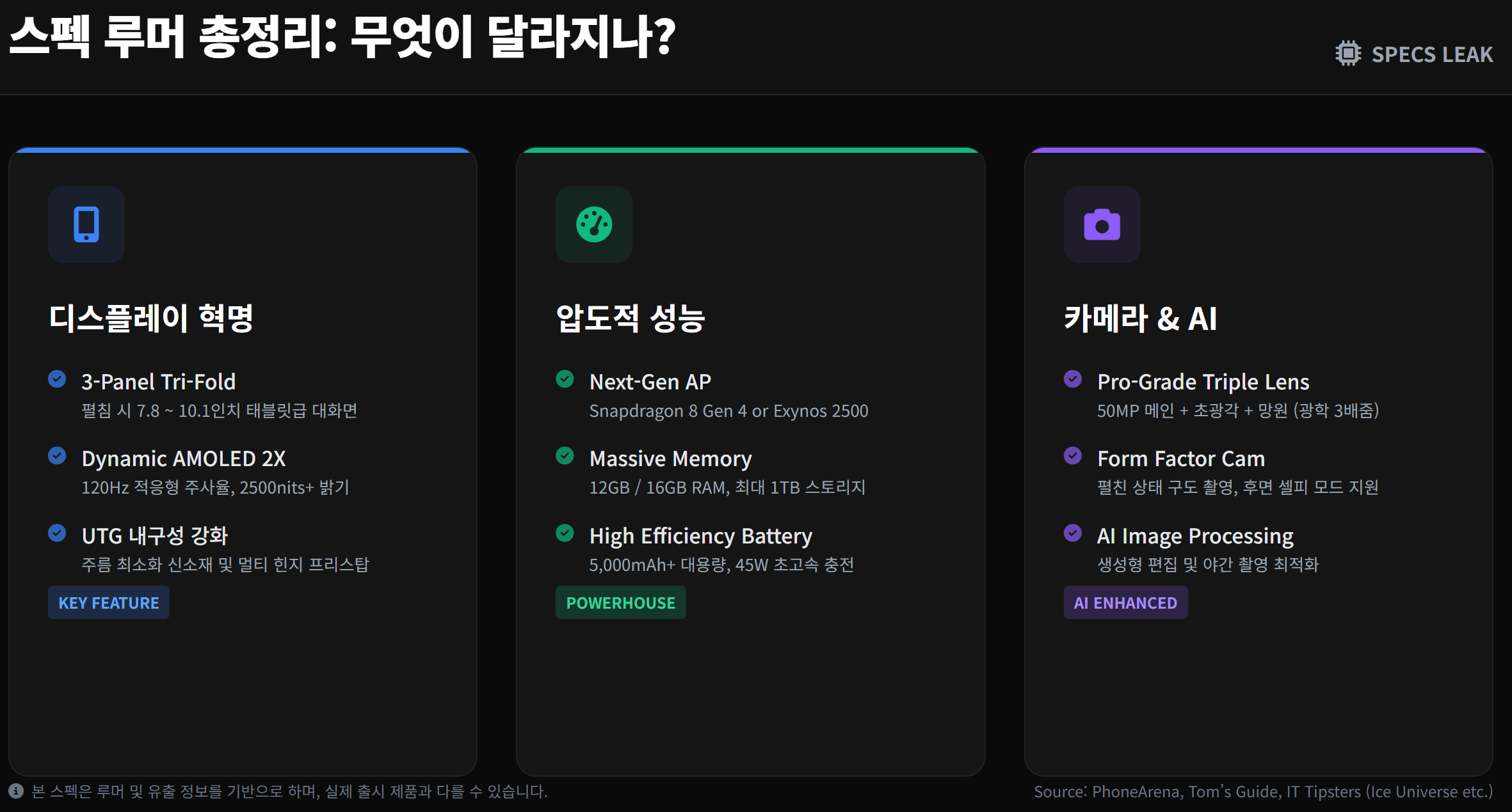 현재까지 유출된 정보를 바탕으로 트라이폴드의 강력한 예상 스펙을 정리해 보았습니다.