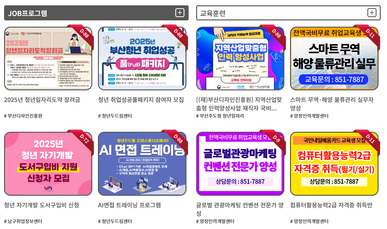 - **직업능력개발훈련사업:** 부산시에서 주관하는 **직업 교육 훈련** 과정을 안내하여 구직자 및 재직자의 직무 전문성을 향상시킵니다.