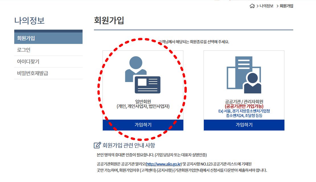 가장 많이 실수하는 부분이 '개인회원' 가입입니다. 반드시 아래 순서를 따라주세요.