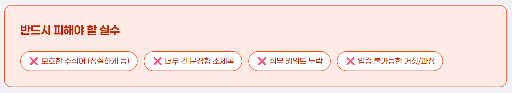 "성실함으로 무장한 인재" 같은 모호한 수식어는 피하세요. 증거가 동반되지 않은 형용사는 인사담당자가 가장 먼저 스킵하는 표현입니다.