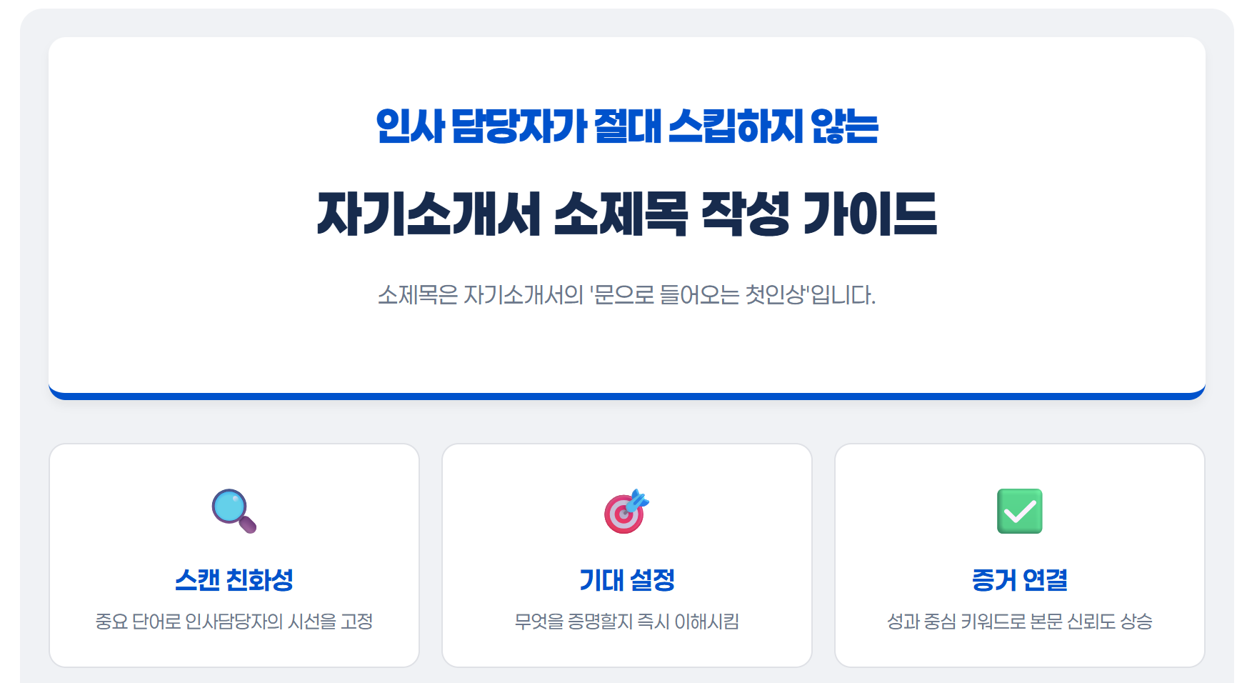 인사담당자는 모든 문장을 정독하지 않습니다. 대신 소제목을 스캔하며 '이 문단을 읽을 가치가 있는가'를 판단하죠. 잘 쓴 소제목은 다음과 같은 역할을 합니다.