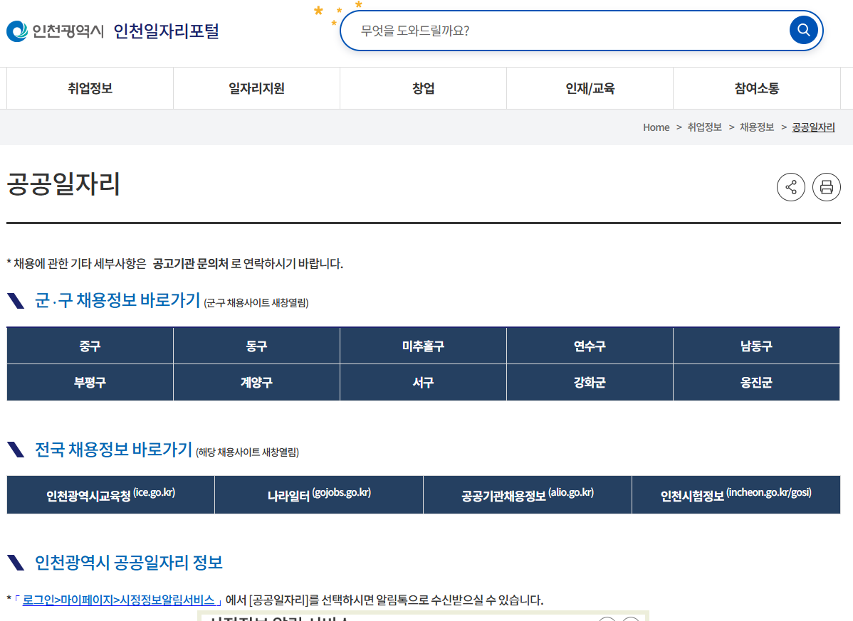 인천일자리포털은 공공근로 외에도, 인천시 산하 공사·공단 및 기관의 정규직, 공무직, 기간제 채용 정보를 통합적으로 제공합니다.