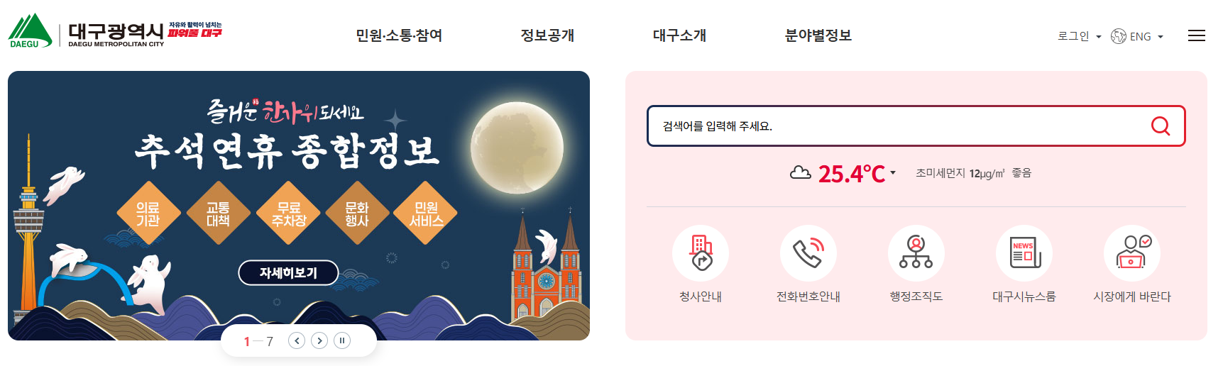 - 채용 정보: 통합 검색, 기업 채용 정보, **대구시/구군 채용정보** 등 지역 일자리 공고를 확인.