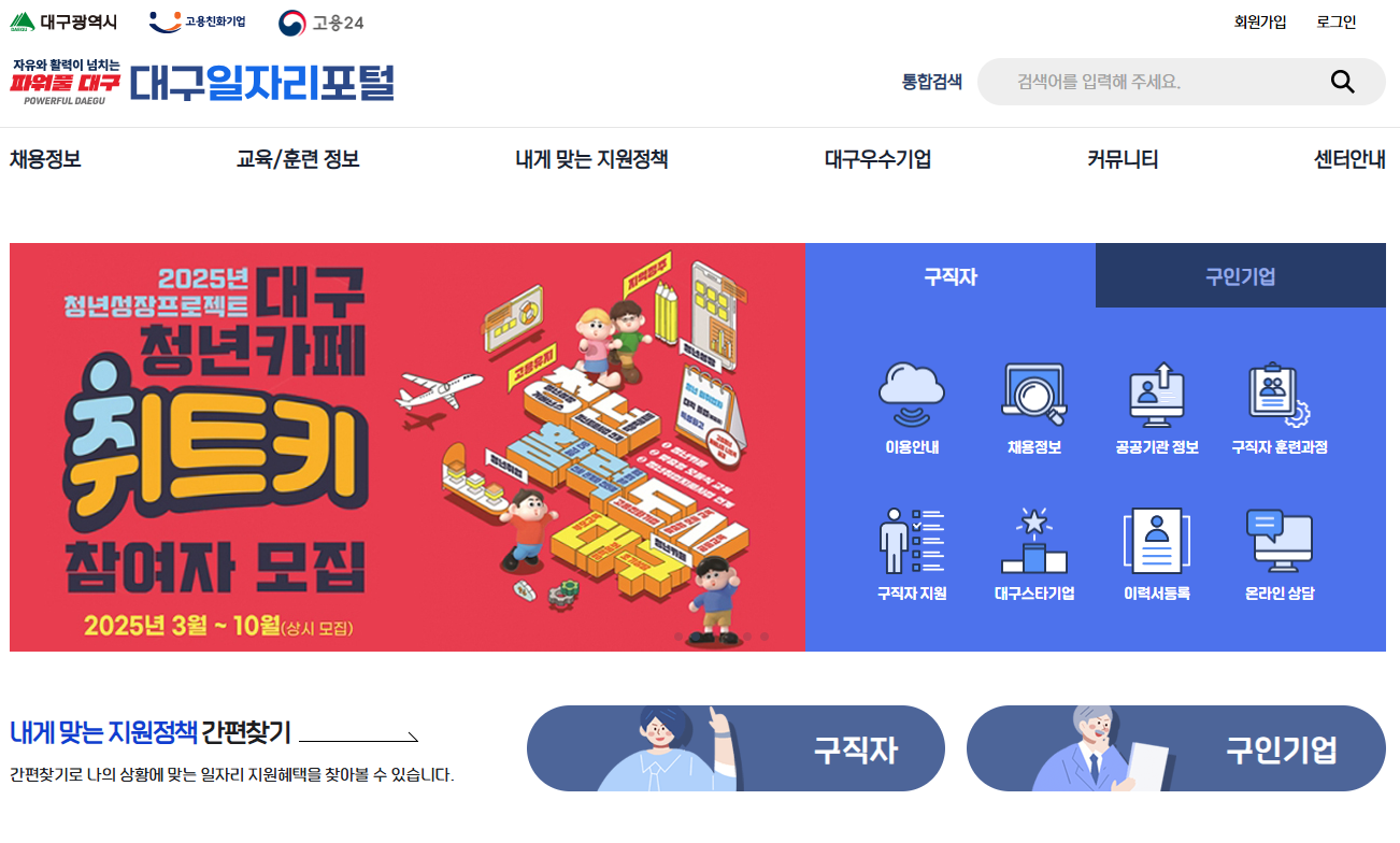 대구시의 모든 구인·구직 및 일자리 정책 정보를 모아놓은 공식 웹사이트입니다.