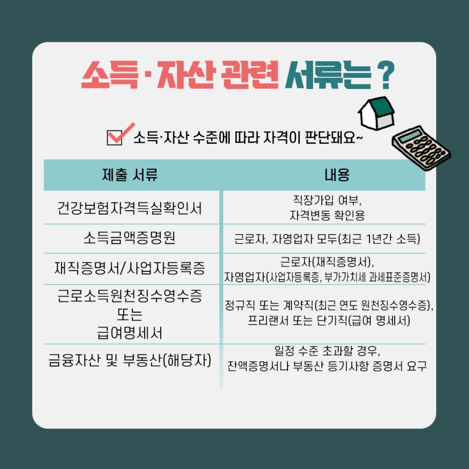 **TIP:** 소득·자산 자료는 공적 자료(국세청, 건강보험, 금융조회 등)를 통해 확인되는 경우가 많으므로 제출 시점의 최신 자료(발급일 기준 유효기간 내)를 준비하세요.