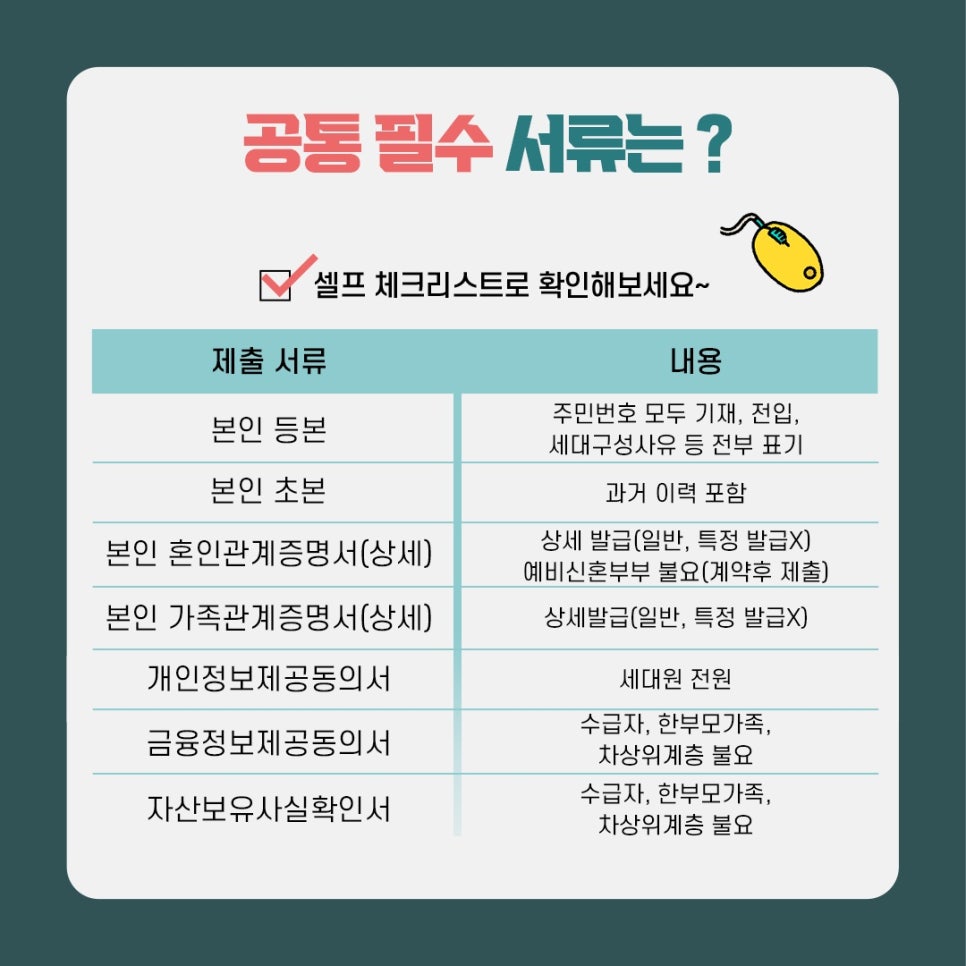 - 공통 필수 서류(신청 시 반드시 제출해야 하는 문서)