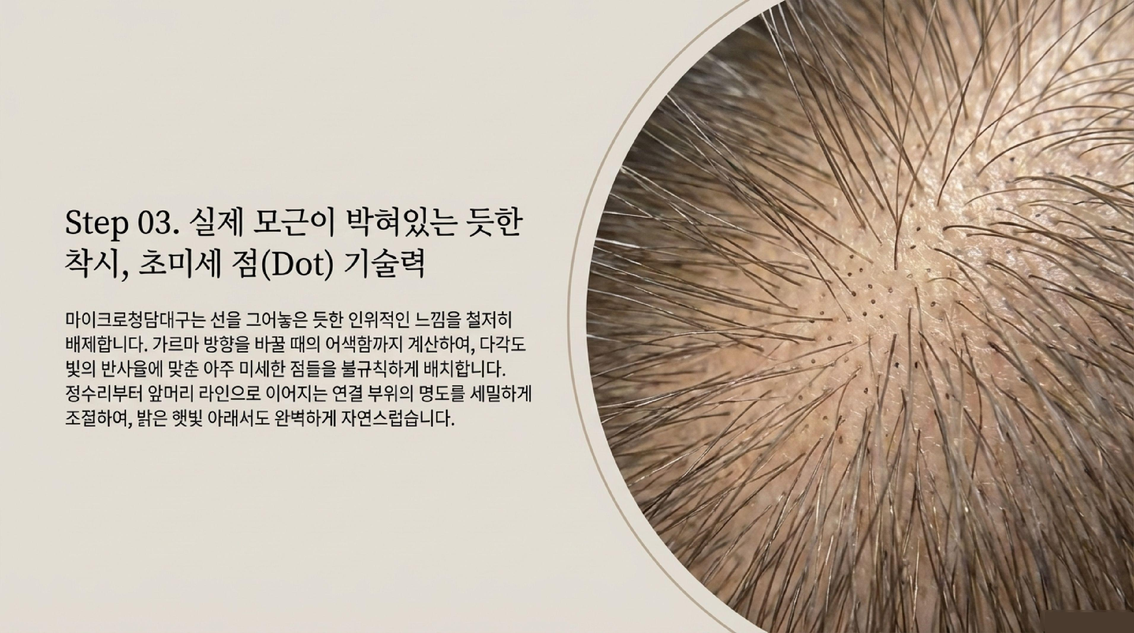 | 시술 기법 | 일률적인 간격/진하기 | 개인 모류 맞춤 미세 도트 |