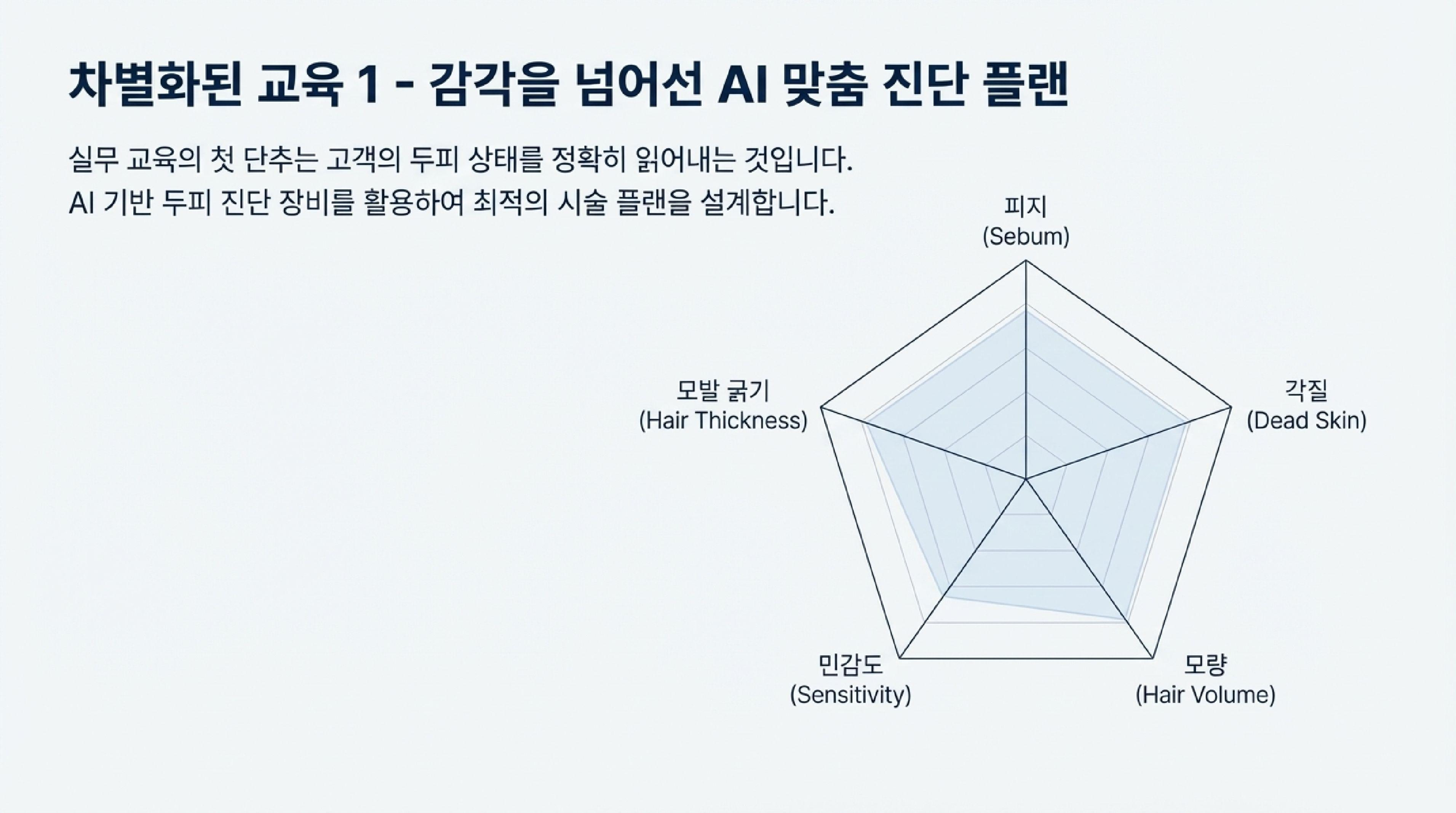 저희는 AI 기반 두피 진단 디바이스를 통해 피지량, 각질, 민감도 등 5가지 요소를 분석합니다. 이 데이터를 바탕으로 지성 두피에는 어떤 점도가 적당한지, 민감성 두피에는 어떤 압조절이 필요한지 맞춤형 용품 운용법을 교육합니다.